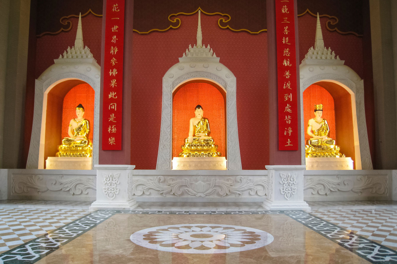 佛堂正殿供奉以頂級「三尺⽩」漢⽩⽟雕刻的橫三世佛(釋迦牟尼佛/藥師佛/阿彌陀佛),佛像額寬臉圓,兩頰豐潤,五官起伏處理細膩,神情靜謐⽽端嚴,光影之下栩栩如⽣,宛如親臨傳授佛法,普渡眾⽣。