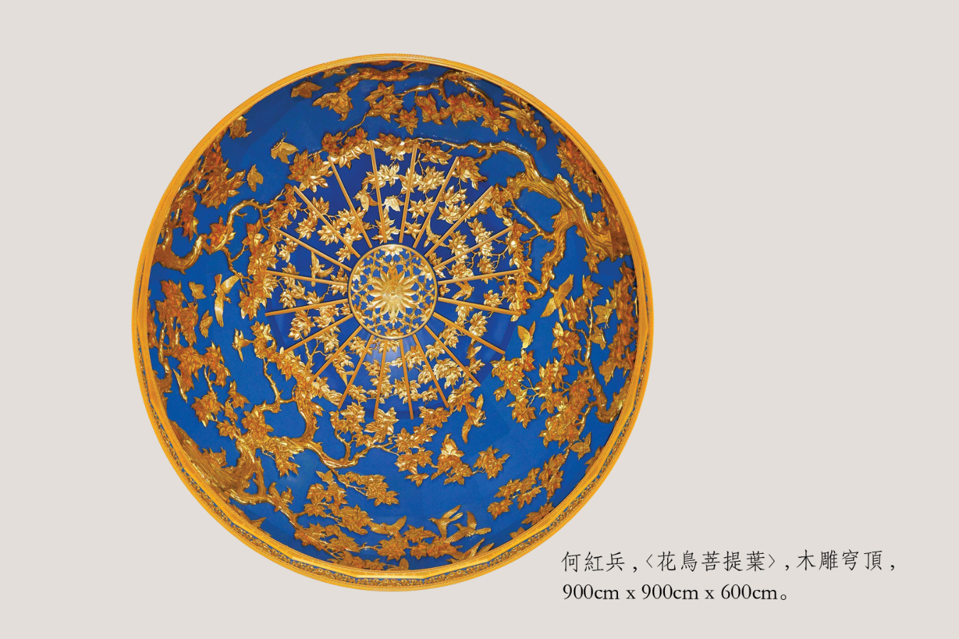 再往正殿,⽊雕穹頂鑲嵌著中國著名的⼯藝美術⼤師何紅兵先⽣的作品-花⿃菩提葉。相傳釋迦摩尼於菩提樹下悟道成佛,這件直徑九公尺的⽊雕作品,傳遞出菩提所代表的覺悟與智慧。