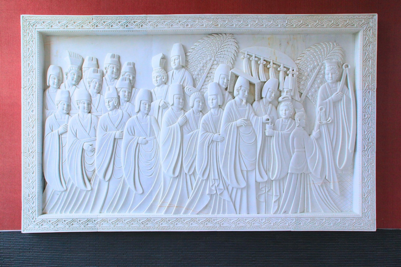 進入佛堂,掛落的雙⾯⽊雕映入眼簾,左右兩側的半圓雕漢⽩⽟壁飾,是以半圓雕的⽅式重現中國北魏時期的宗教作品-帝后禮佛圖。