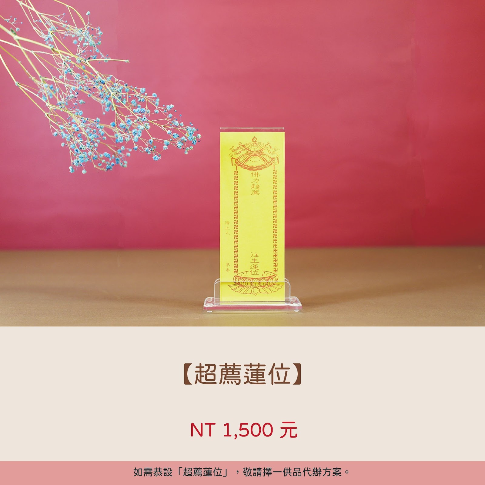 • 每座超薦蓮位可供六位先人,如需恭設兩座以上超薦蓮位,第二座起每座需加收 1,500 元。